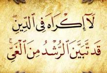 «لا إِكْراهَ فِي الدِّينِ قَدْ تَبَيَّنَ الرُّشْدُ مِنَ الْغَيِّ فَمَنْ يَكْفُرْ بِالطَّاغُوتِ وَ يُؤْمِنْ بِاللَّهِ فقد استَمْسَكَ بِالْعُرْوَةِ الْوُثْقى لاَ انْفِصامَ لَها وَ اللَّهُ سَميعٌ عَليمٌ»؛ ترجمه انصاریان: در دين، هيچ اكراه و اجبارى نيست [كسى حق ندارد كسى را از روى اجبار وادار به پذيرفتن دين كند، بلكه هر كسى بايد آزادانه با به كارگيرى عقل و با تكيه بر مطالعه و تحقيق دين را بپذيرد]. مسلماً راه هدايت از گمراهى [به وسيله قرآن، پيامبر و امامان معصوم] روشن و آشكار شده است. پس هر كه به طاغوت [كه شيطان، بت و هر طغيان گرى است] كفر ورزد و به خدا ايمان بياورد، بى ترديد به محكم ترين دستگيره كه آن را گسستن نيست، چنگ زده است؛ و خدا شنوا و داناست.(1)